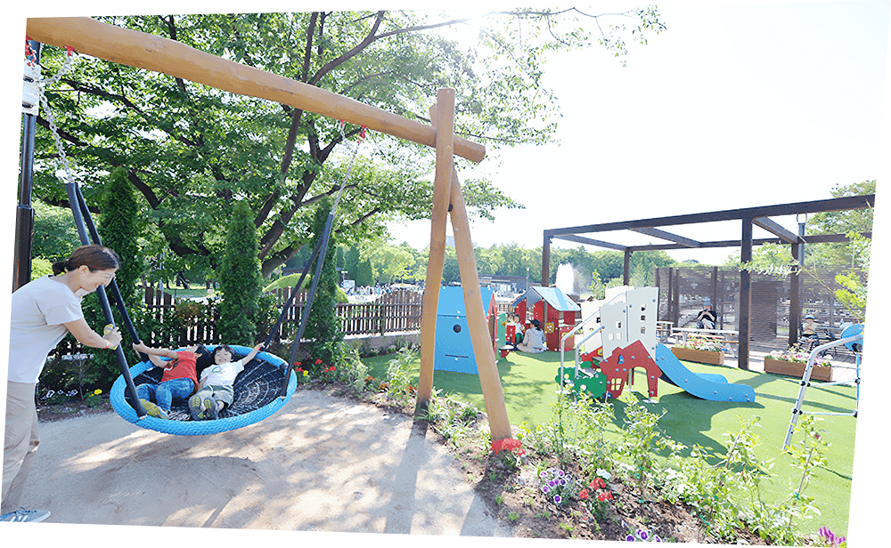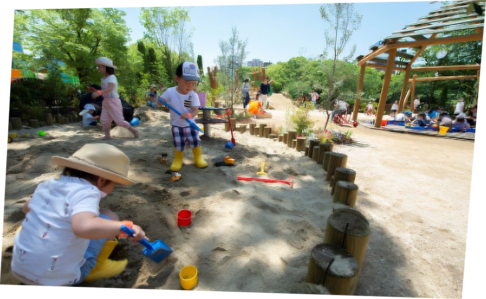 午前中のプレイヴィルでまずは屋外ゾーンを探検。季節の花や葉っぱを探したり、ダイナミックに身体を動かしたりしながら、すがすがしい朝の公園で自然遊びや水遊び・砂遊びを体験してみよう。