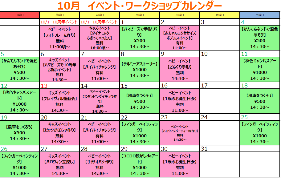 10月のイベントカレンダーが出来上がりましたのでお知らせいたします!